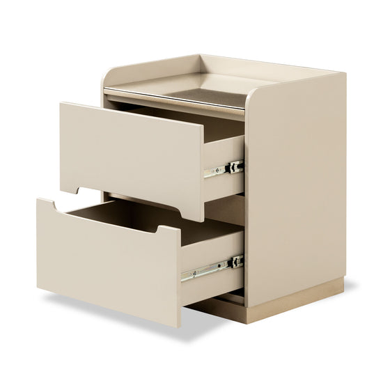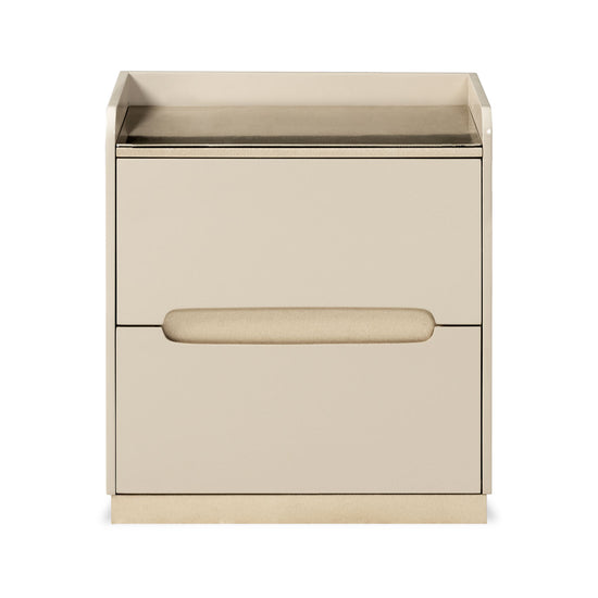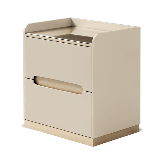 La Mesa de Noche Bilbao Beige, Champaña Ultraglass aporta sofisticación y estilo a tu habitación. Su cubierta proporciona un acabado elegante y moderno, mientras que su diseño funcional ofrece un almacenamiento práctico.