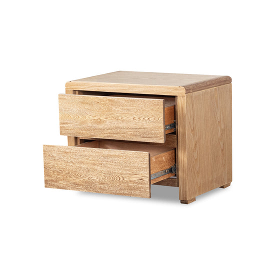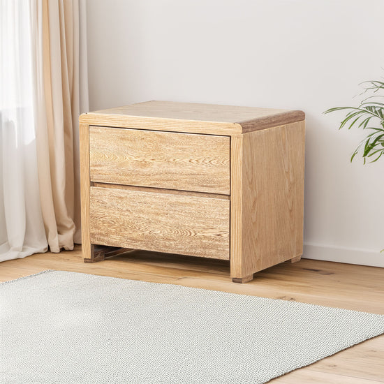 La Mesa de Noche Ceratto 2 Gavetas Natural aporta calidez y estilo a tu habitación. Elaborada en madera de roble con acabado semimate y pintura poliuretano, combina durabilidad y elegancia. Sus dos amplias gavetas ofrecen espacio funcional sin perder el encanto natural del diseño moderno.