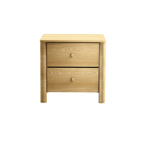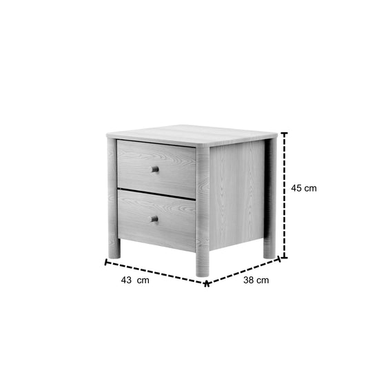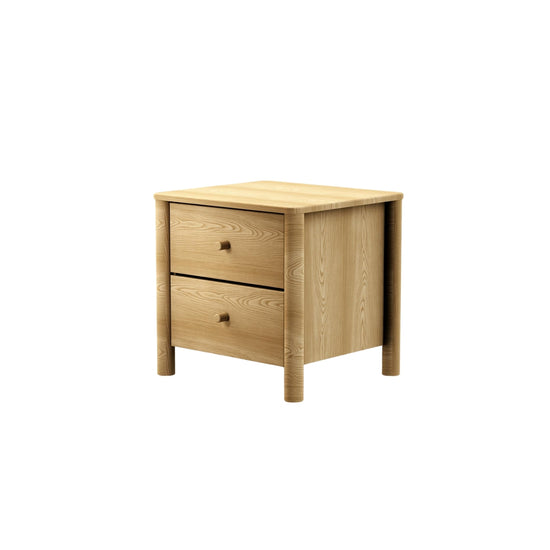 Elegante mesa de noche en color natural, con vetas visibles que resaltan la belleza de la madera. Dos cajones espaciosos ofrecen un diseño funcional y acogedor para cualquier dormitorio.