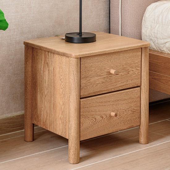 Elegante mesa de noche en color natural, con vetas visibles que resaltan la belleza de la madera. Dos cajones espaciosos ofrecen un diseño funcional y acogedor para cualquier dormitorio.