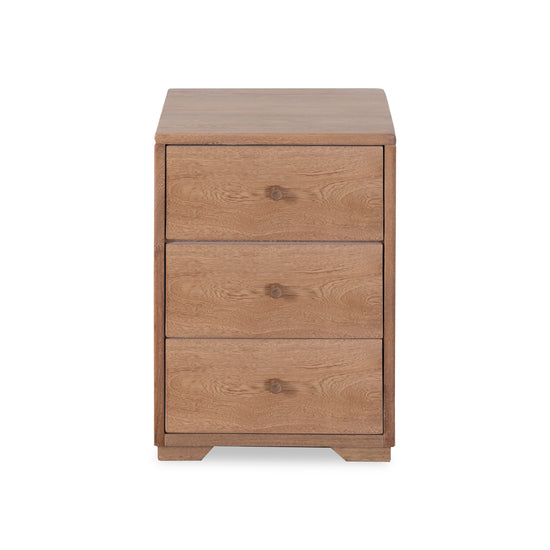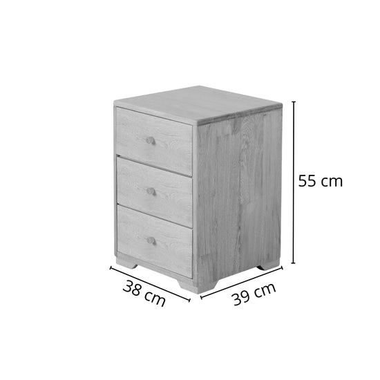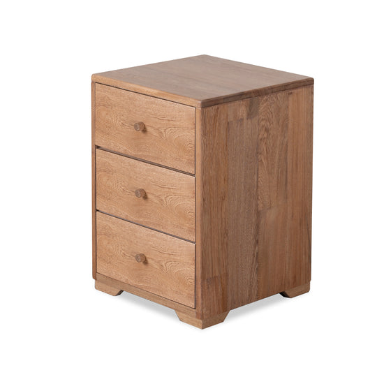 Descubre la belleza natural de nuestra mesa de noche, elaborada con una estructura de madera de roble en color natural que resalta la elegante veta de la madera. Contiene tres gaveta ideal para mantener tus esenciales al alcance de la mano.