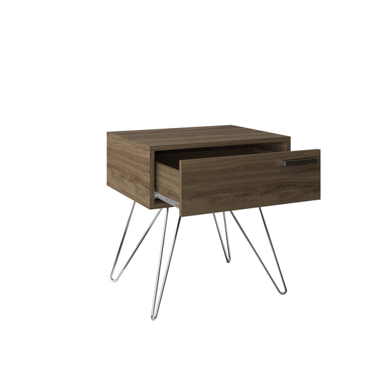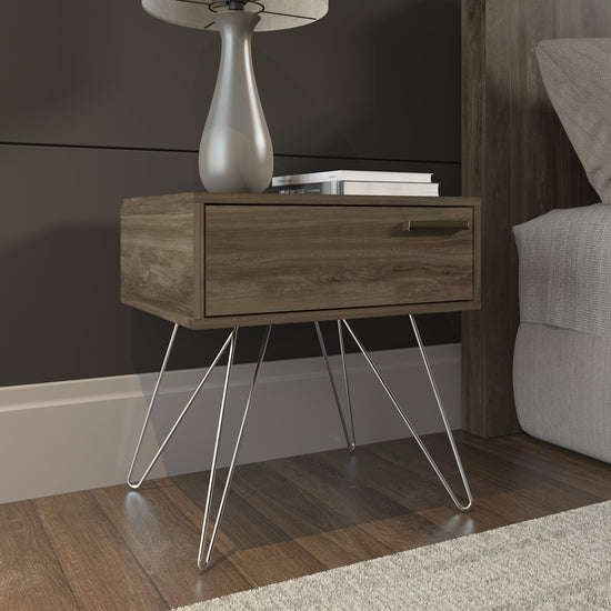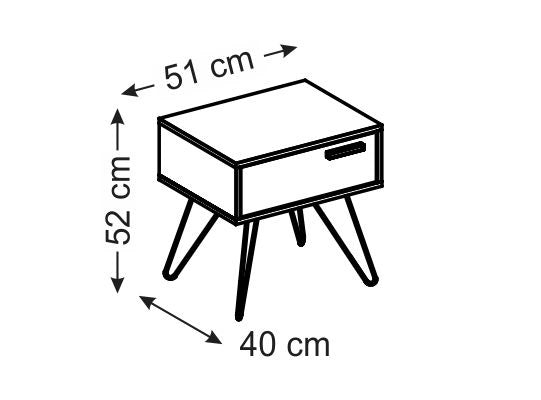 Nochero elaborado en tablero MDF/MDP de pino, con acabados de mayor calidad en UV que mantiene la pintura intacta sin perder el color en el tiempo, contiene tiene 1 gaveta con rieles extensibles y patas metálicas. Medidas: 51x52x40 cm.