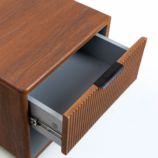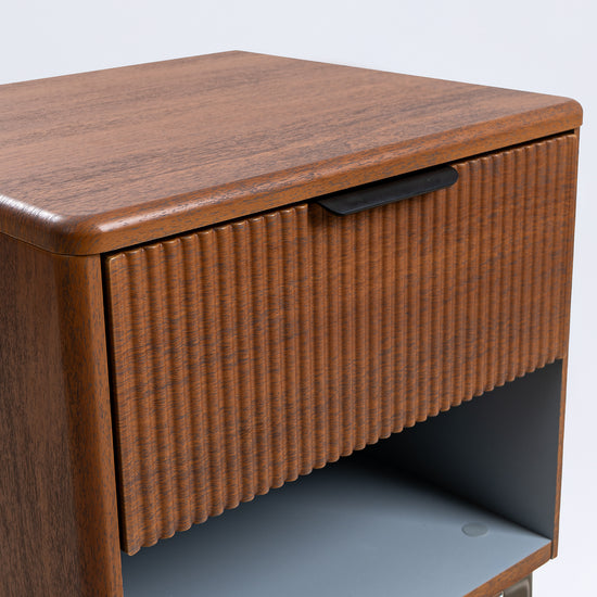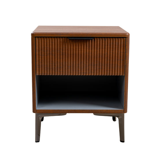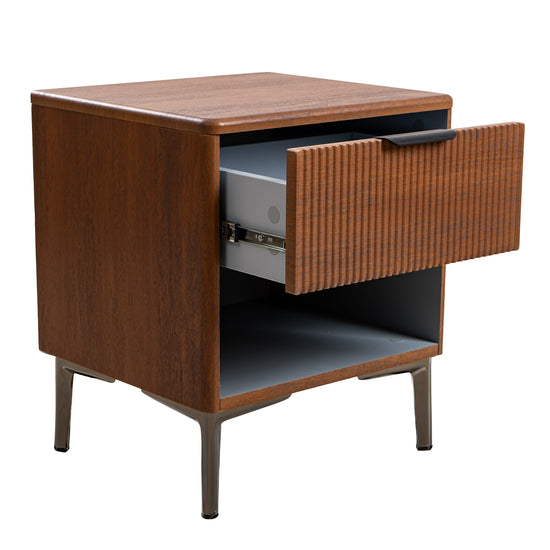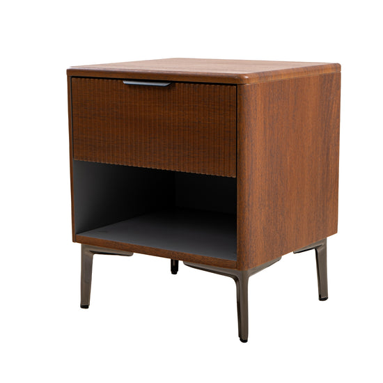 La Mesa de Noche Ibiza Natural Medio destaca por su equilibrio visual. Su acabado intermedio se adapta fácilmente a distintos estilos, mientras las patas metálicas y el cajón texturizado añaden un toque contemporáneo y funcional al espacio.