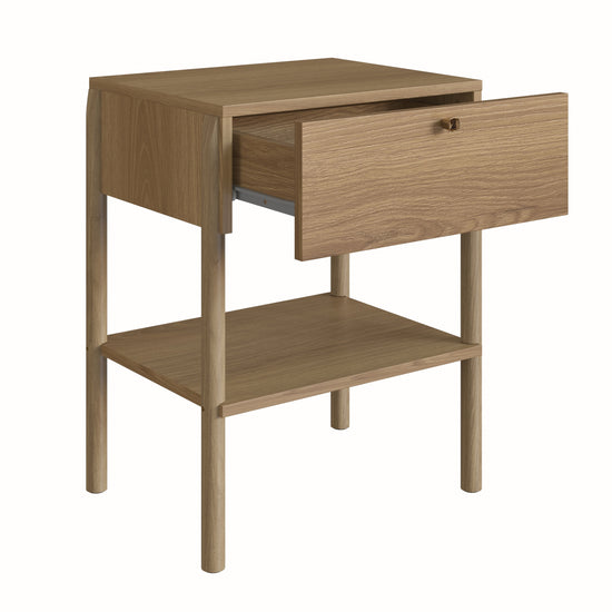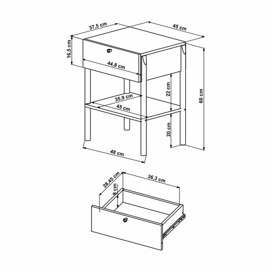 La Mesa de Noche Keops Natural se distingue por su diseño minimalista y funcional. Posee un cajón superior para mantener organizados los objetos personales y una repisa inferior práctica para libros o accesorios. Sus líneas rectas y patas cilíndricas le aportan un estilo moderno y versátil, ideal para dormitorios que buscan calidez y elegancia atemporal.