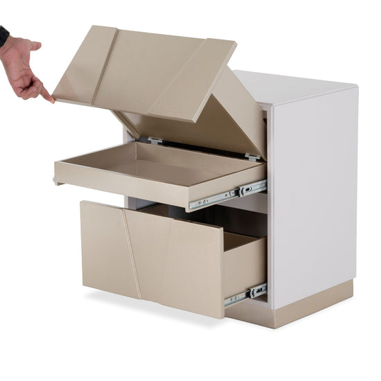 El Nochero Monaco redefine la organización con un diseño sofisticado y práctico que se adapta a cualquier espacio. Su estructura moderna cuenta con compartimentos de almacenamiento innovadores, incluyendo una gaveta superior con apertura abatible, ideal para mantener tus accesorios al alcance de la mano, y gaveta inferior con corredores de extensión total, que garantizan un acceso cómodo y eficiente.