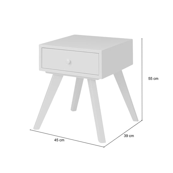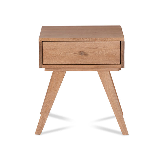 Descubre la belleza natural de nuestra mesa de noche, elaborada con una estructura de madera de roble en color natural que resalta la elegante veta de la madera. Contiene una gaveta ideal para mantener tus esenciales al alcance de la mano.