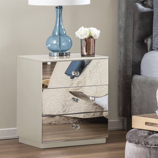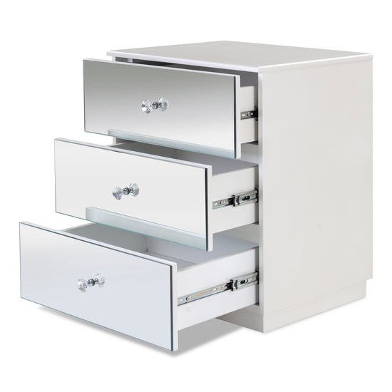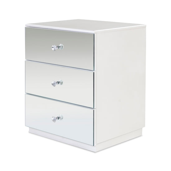 Nochero elaborado con materiales certificados, madera color perla con espejos y acabado catalizado, tres canjones con manijas