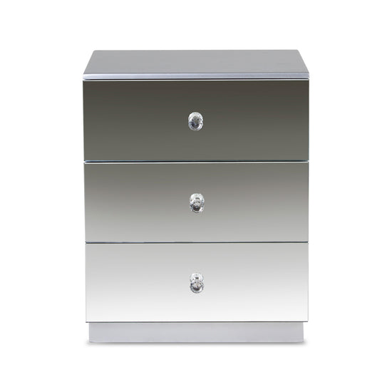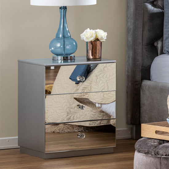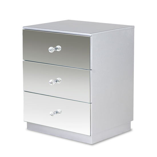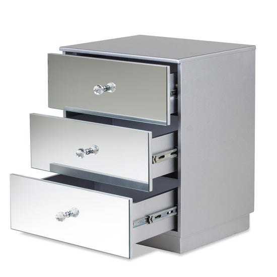 Nochero elaborado con materiales certificados, madera color plata con espejos y acabado catalizado, tres canjones con manijas