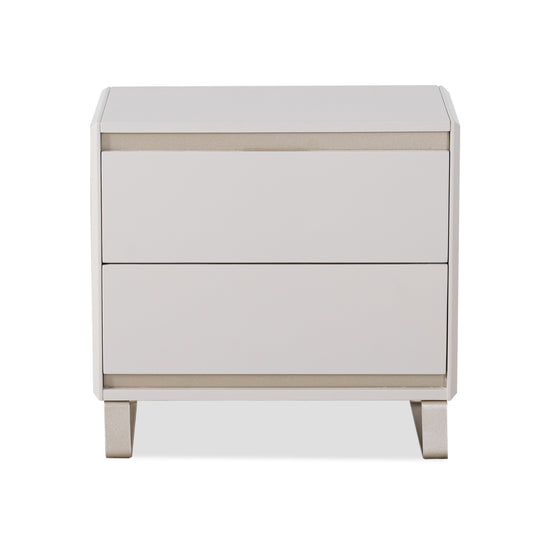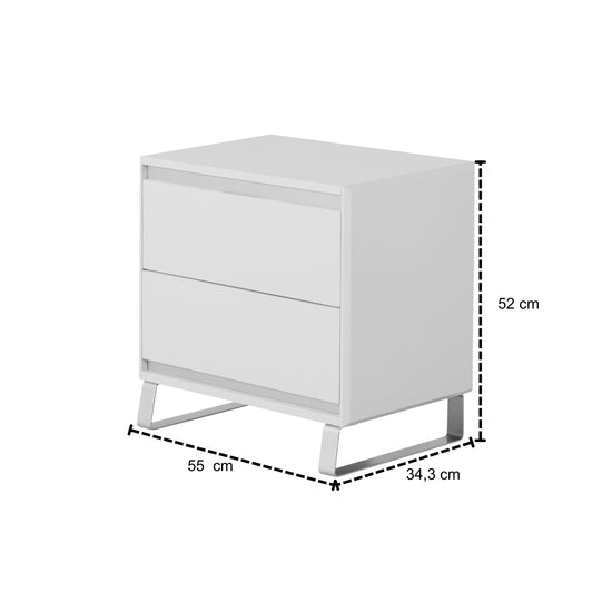 Nuestra mesa de noche exclusiva de estilo moderno es el complemento perfecto para añadir elegancia a tu dormitorio. Con dos gavetas espaciosas y patas metálicas resistentes, esta mesa de noche combina funcionalidad y diseño sofisticado.