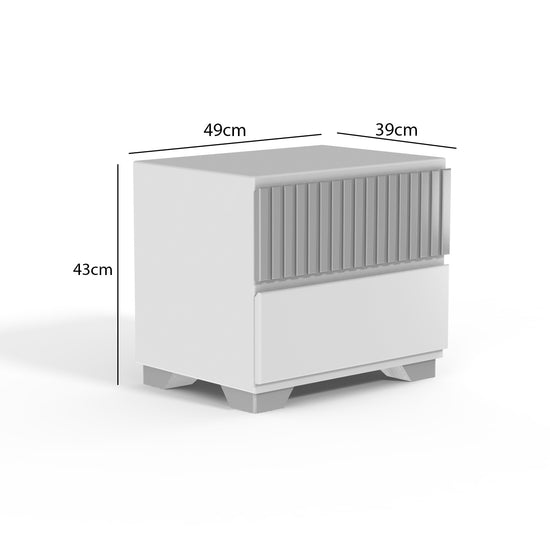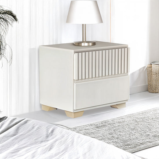 La Mesa de Noche Texas Off White es una pieza moderna y sofisticada, elaborada en madera de alta calidad y acabada con pintura poliuretano que garantiza durabilidad y un acabado elegante. Cuenta con dos gavetas que ofrecen amplio espacio de almacenamiento, perfectas para mantener el orden en tu dormitorio. Su diseño minimalista se realza con detalles en color champaña, aportando un toque de lujo y estilo contemporáneo.