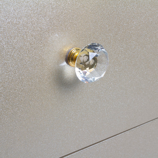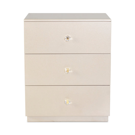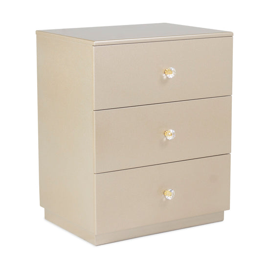 Esta Mesa de Noche Tiana Champaña es perfecto para complementar tu habitación, ofreciendo un producto elegante y moderno con facilidad de mantenimiento. Su duradera pintura resistente a derrames líquidos y su sólida estructura de madera certificada aseguran resistencia y durabilidad. Equipado con tres gavetas y manijas con apliques brillantes, brinda espacio de almacenamiento para tus objetos personales y se convierte en un compañero ideal para momentos de relajación o para disfrutar de la compañía en tu espacio de descanso.