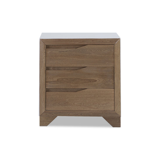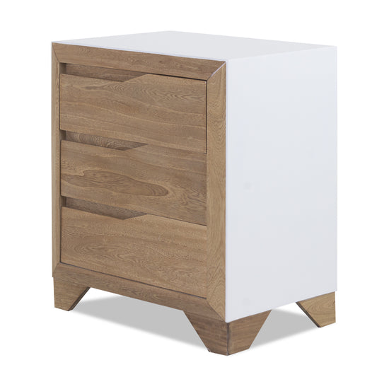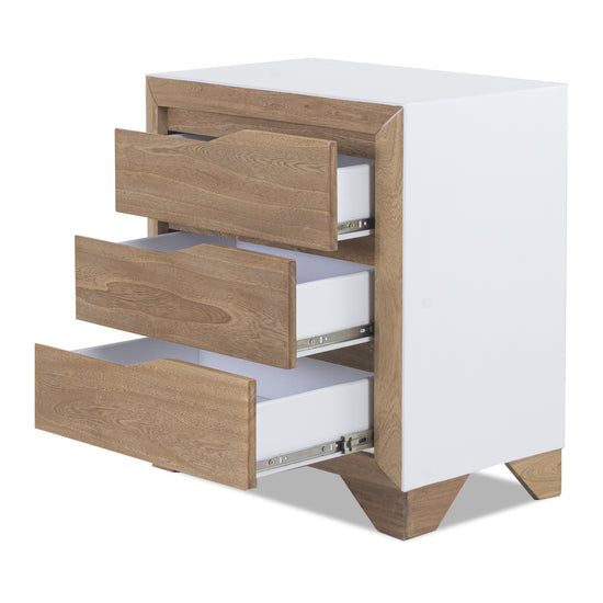La Mesa de Noche Toledo Natural, Blanco exhibe una estructura de madera a la vista, destacando su veta exótica y su durabilidad para garantizar una larga vida útil. Su diseño contemporáneo se adapta fácilmente a cualquier estilo de decoración en tu habitación.