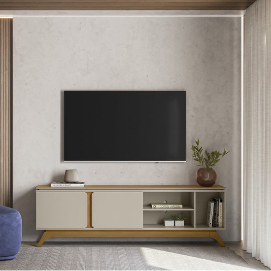 Renueva tu sala con esta elegante mesa de TV, diseñada para televisores de hasta 65 pulgadas. Su estructura combina funcionalidad y estilo, con una repisa de acabado biselado que aporta un toque sofisticado y un panel con detalles redondeados que suaviza su diseño.