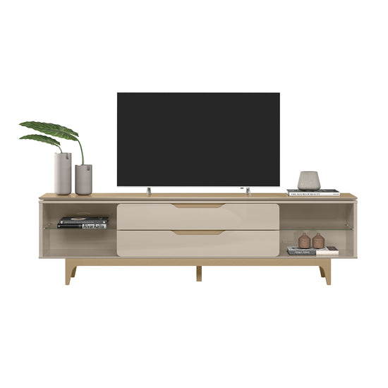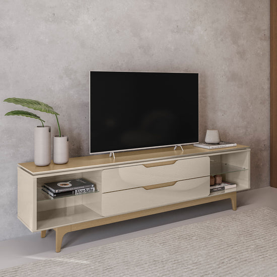 Mesa TV elaborada en madera industrializada de pino y acabado en pintura UV que garantiza su durabilidad y resistencia. Cuenta con una repisa de vidrio, base con acabado moderno, 2 gavetas con riel telescópico para un almacenamiento conveniente y patas de madera maciza aportan un toque de calidez y robustez. Con espacio para TV de hasta 75" en color perla y champán, para una organización eficiente con un toque de elegancia. Transporte y armado gratis