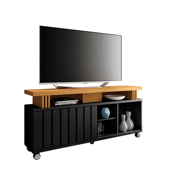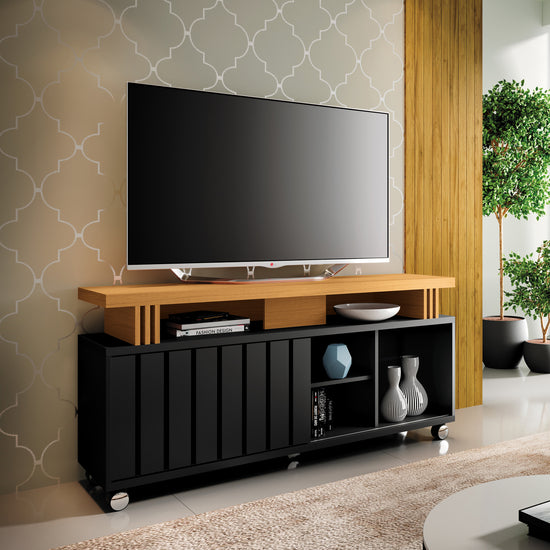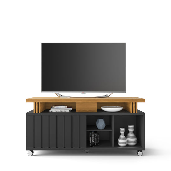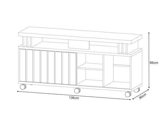 Mesa TV elaborada en madera industrializada de pino (MDF/MDP) y acabado en pintura UV que garantiza su durabilidad y resistencia. Cuenta con 3 nichos, puerta corredizas y rodachines para fácil movilidad. ¡Moderna, resistente y práctica para tu entretenimiento en casa! Con espacio para TV de hasta 50". Transporte y armado gratis