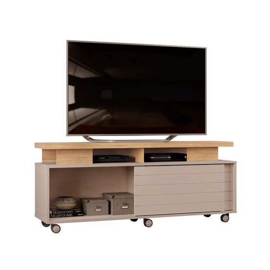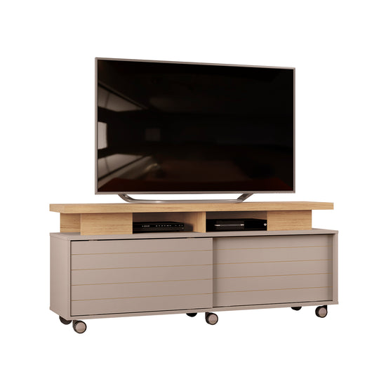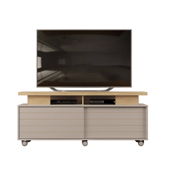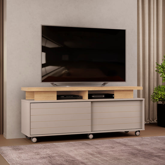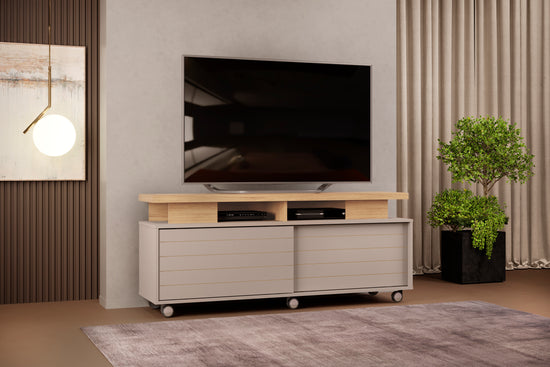 La mesa de TV Barton Natural está fabricada en tablero de MDF/MDP de pino con un atractivo acabado en pintura UV en tonos Natural y Gris. Con capacidad para televisores de hasta 60", ofrece un amplio espacio de 150 x 33 cm (AnchoxAlto) para colocar tu pantalla. Equipada con dos nichos y puertas corredizas, brinda espacio adicional para almacenar tus dispositivos multimedia y otros accesorios. Además, cuenta con áreas designadas para exhibir tus decoraciones favoritas, manteniendo tu espacio organizado y con un toque de elegancia. El transporte y armado son gratuitos, asegurando una experiencia sin complicaciones desde la compra hasta la instalación.