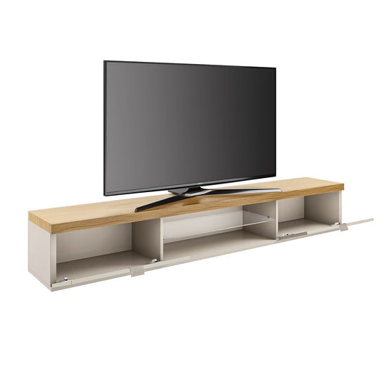El Mueble de TV Flotante en Madera Industrializada de Pino destaca por su acabado de pintura UV de alta calidad, que asegura colores vivos y duraderos. Equipado con dos puertas abatibles con elegantes manijas metálicas y una repisa de vidrio, este mueble transforma tu sala de estar en un espacio elegante y funcional, añadiendo armonía y estilo a tu hogar. Con dimensiones de 180x27x31 cm, es la elección perfecta para organizar y embellecer tu entretenimiento en casa.