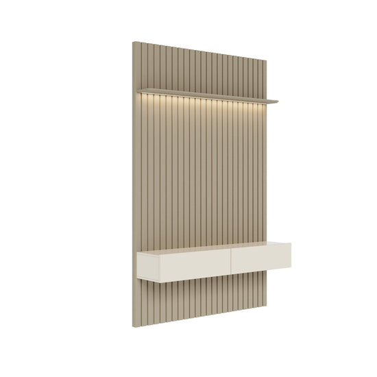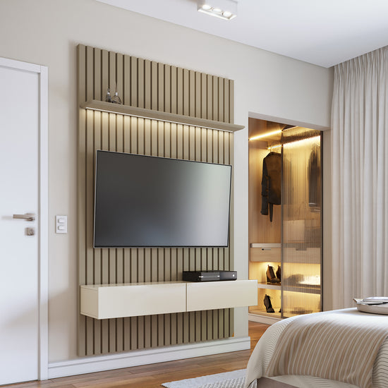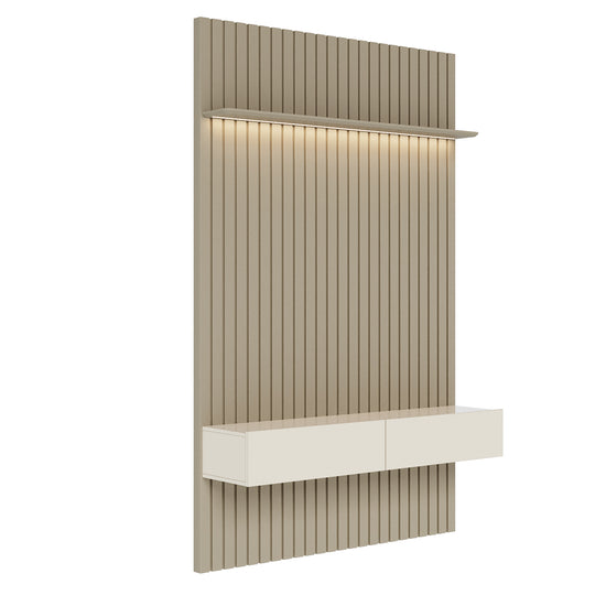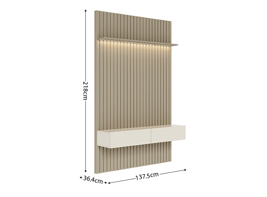 Panel de TV elaborado en madera industrializada de pino (MDF/MDP), con una pintura UV que garantiza durabilidad y resistencia. Su diseño parrillado añade un toque contemporáneo y atractivo, convirtiéndolo en el punto central de tu sala de estar. Además, cuenta con una repisa superior que proporciona espacio para exhibir objetos decorativos, fotografías y otros elementos personales, agregando un toque personalizado a tu espacio. Incluye un mueble flotante con 2 gavetas equipadas con riel telescópico, ideal para organizar accesorios multimedia y otros elementos. Con capacidad para televisores de hasta 55 pulgadas, este panel viene con un soporte para TV que asegura una instalación segura y estable. También cuenta con iluminación LED para crear un ambiente acogedor y moderno. Disfruta de transporte y armado gratuitos para una experiencia de compra conveniente y sin complicaciones.