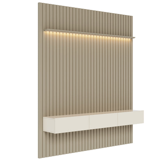 Panel de TV elaborado en madera industrializada de pino (MDF/MDP), con una pintura UV que garantiza su durabilidad y resistencia. Su diseño parrillado añade un toque contemporáneo y atractivo, convirtiéndolo en un punto central destacado en tu sala de estar. Además, cuenta con repisa superior que brinda espacio para exhibir objetos decorativos, fotografías u otros elementos que desees destacar, añadiendo un toque personalizado a tu espacio. Incluye un mueble flotante con 2 gavetas equipadas con riel telescópico, ideal para organizar tus accesorios multimedia y otros elementos. Con capacidad para televisores de hasta 65 pulgadas, este panel incluye un soporte para TV que asegura una instalación segura y estable. Además, cuenta con luz LED para crear un ambiente acogedor y moderno. Transporte y armado gratis.