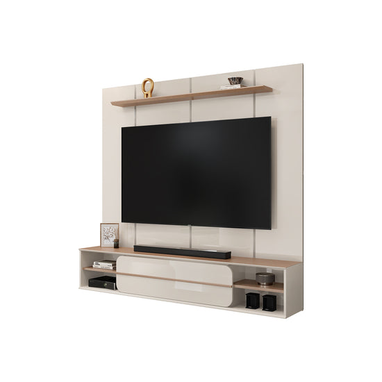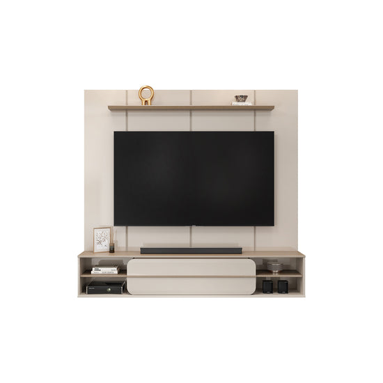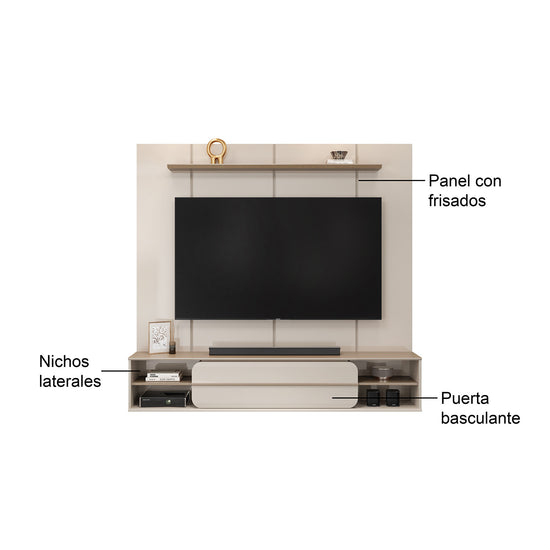 El Panel de Tv Alany Off White, Champaña combina elegancia y funcionalidad. Fabricado en madera industrializada de pino, tiene un acabado con pintura UV que garantiza una larga vida útil. Incluye una puerta abatible con esquinas redondeadas y cuatro nichos laterales para almacenamiento adicional. Este panel soporta televisores de hasta 70'', agregando estilo y orden a tu espacio con un toque sofisticado.