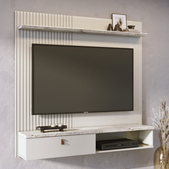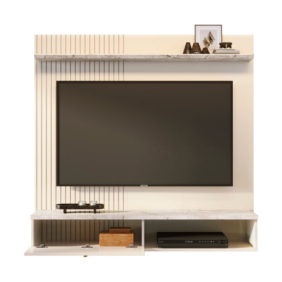 El Panel de TV Atenea Mármolado está elaborado en madera industrializada de pino, destacando por su diseño elegante y moderno. Cuenta con una puerta abatible con bisagras metálicas, detalles de listones en el panel, y una manija con acabado dorado mate y cuero sintético. Con espacio para TV hasta 55", es la opción perfecta para complementar tu sala con estilo y funcionalidad.