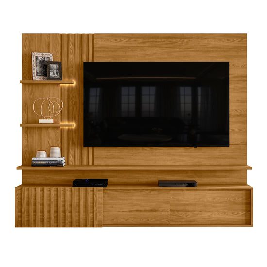 Panel de Tv elaborado en tablero MDF/MDP de pino es una pieza exquisita con pintura UV, color Natural. Cuenta con 2 cintas de Luces LED, Detalles Parillados 3 puertas correderas 3 repisas. Espacio de TV Hasta 65 Transporte y armado gratis. Espacio
