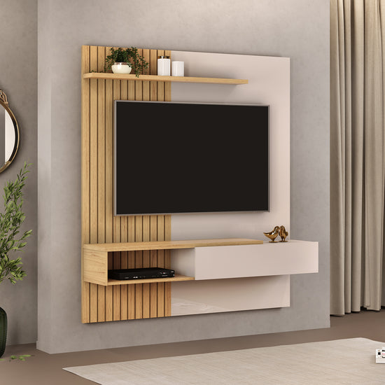 El Panel de Tv Sari Natural, Off White 150X164, fabricado en Madera Industrializada de pino y recubierto con pintura UV, presenta un diseño único con una puerta basculante equipada con un brazo metálico y un detalle parrillado, que añade un toque distintivo y estilizado al conjunto. Esta puerta basculante se desplaza suavemente hacia arriba y hacia abajo, proporcionándote un acceso cómodo a tus equipos cuando lo necesites. Además de su funcionalidad, este panel ofrece una solución práctica para ocultar los dispositivos multimedia y otros objetos cuando no están en uso, manteniendo así un aspecto ordenado y limpio en tu espacio de entretenimiento. Con capacidad para televisores de hasta 65 pulgadas, este panel también incluye un soporte para TV, asegurando una instalación segura y estable de tu televisor. Con su diseño elegante y su ingeniosa funcionalidad, este Panel de TV es una adición imprescindible para cualquier sala de estar moderna y bien equipada.