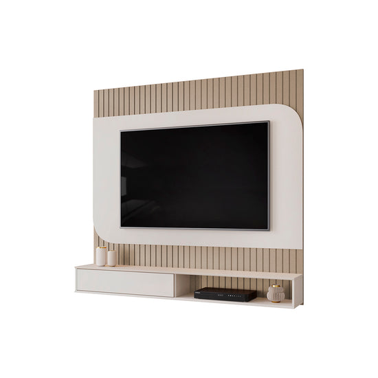 Añade sofisticación a tu hogar con el Panel de TV Tomaz Off White, Champaña. Este panel de madera industrializada de pino con pintura UV incluye una puerta corredera y espacio para dispositivos electrónicos. Sus bordes redondeados y detalles decorativos de frisado dan un toque moderno, perfecto para soportar televisores de hasta 65".