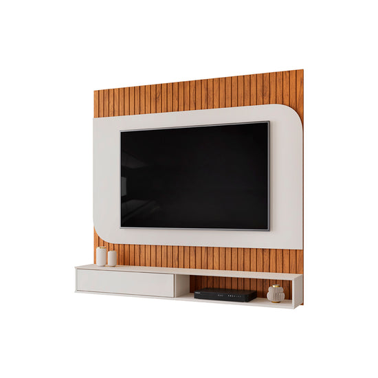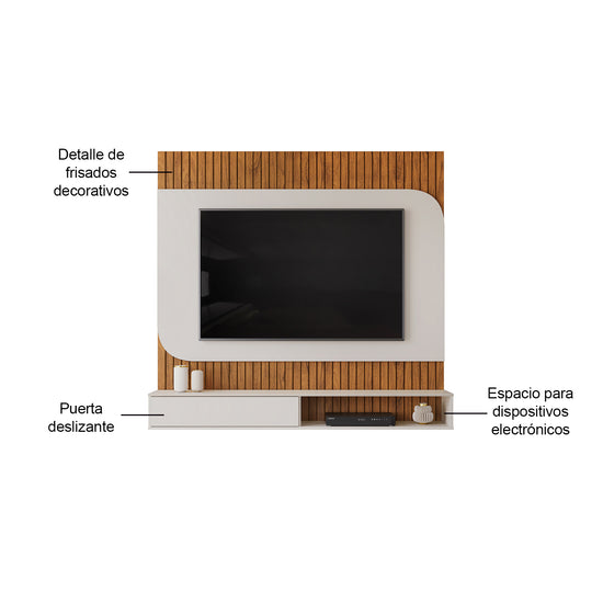 El Panel de TV Tomaz combina funcionalidad y diseño contemporáneo. Elaborado en madera industrializada de pino, con acabado en pintura UV, ofrece un espacio para TV de hasta 65”. Sus bordes redondeados y detalles de frisados decorativos aportan elegancia. Incluye una puerta corredera y nichos para dispositivos electrónicos, asegurando orden y estilo en tu sala.