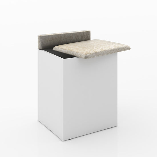 Puff elaborado en MDF/MDP con pintura UV color Blanco, tapizado en tela color Beige, contiene baúl para almacenamiento extra y patas de plástico. Medias: 54,5x38 cm.