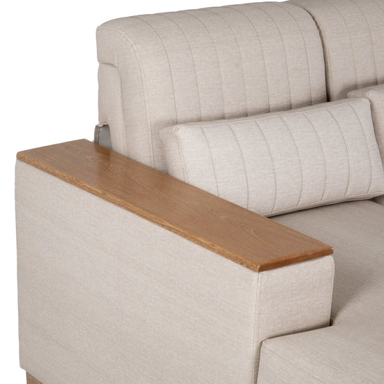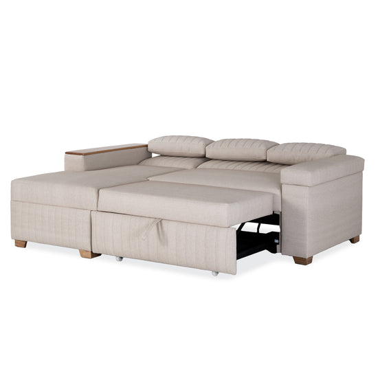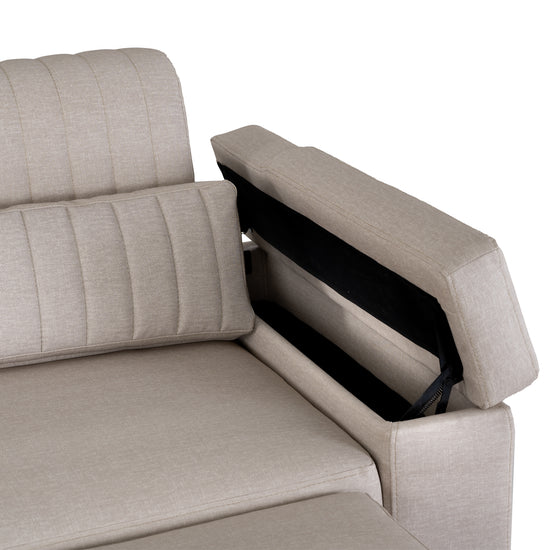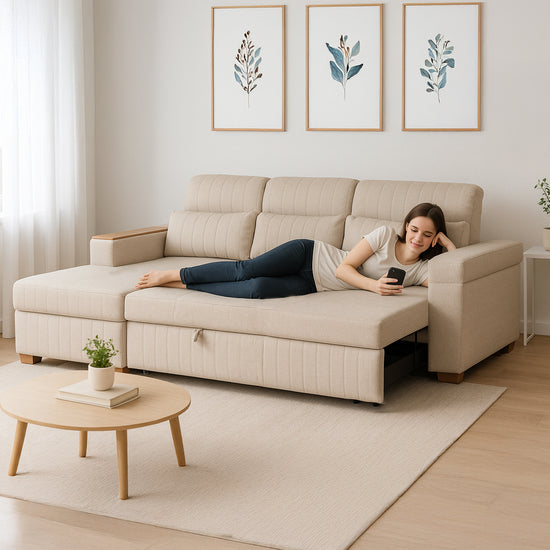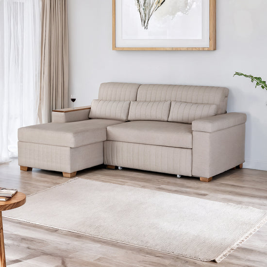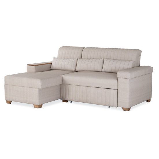 Esta sala cama combina un diseño contemporáneo con funcionalidad práctica, perfecta para espacios versátiles y acogedores. Tapizada en tela Eurolino de fácil limpieza y resistente al uso diario. Su sistema de reclinación Click-Clack y tipo carrito permite transformar el sofá en una cama amplia y cómoda con facilidad. Además, incluye cojines que aportan mayor confort y un toque decorativo. Un detalle distintivo es el brazo lateral con superficie de madera, que puede utilizarse como soporte para colocar objetos decorativos, bebidas o libros. Cuenta con un espacio de almacenamiento integrado en el brazo lateral, ideal para guardar objetos pequeños y mantener el orden en tu sala de estar.