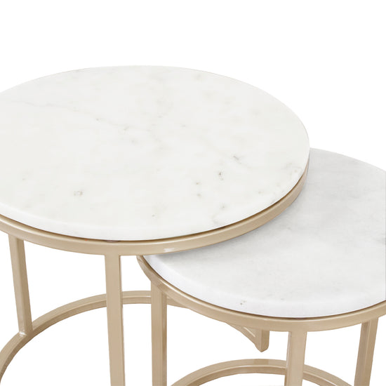 Enriquece el ambiente de su sala de estar con este elegante conjunto de 2 mesas. Estas mesas de centro circulares, elaboradas en metal, aportan un toque de sofisticación a tu espacio. Sus cubiertas de mármol añaden un atractivo extra, fusionándose perfectamente con su estética de diseño moderno.