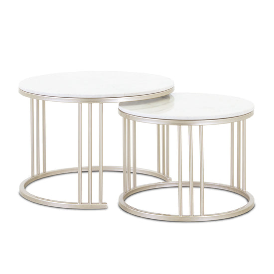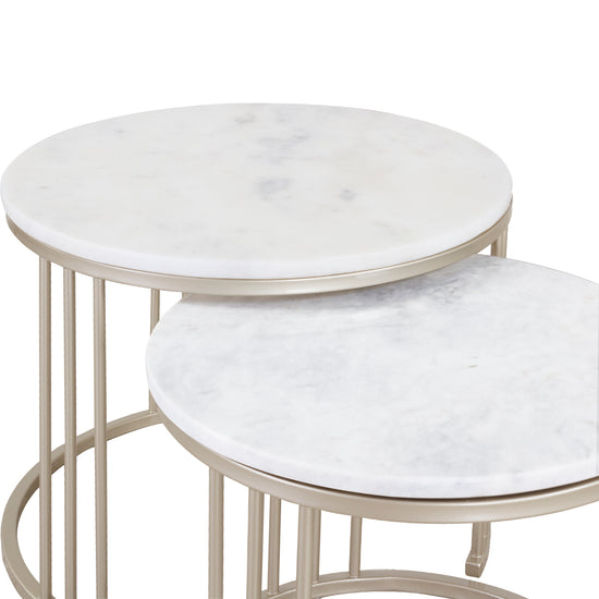 Eleve el estilo de su sala de estar con este elegante set de 2 mesas. Ambas mesas de centro circulares están meticulosamente elaboradas en metal y presentan sofisticadas cubiertas de mármol, que se integran a la perfección con cualquier decoración de diseño moderno. Estas mesas no solo aportan un toque de lujo y refinamiento a su espacio, sino que también ofrecen una funcionalidad versátil. Ideal para complementar y realzar la estética contemporánea de su sala.