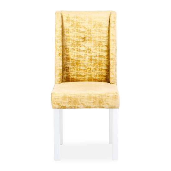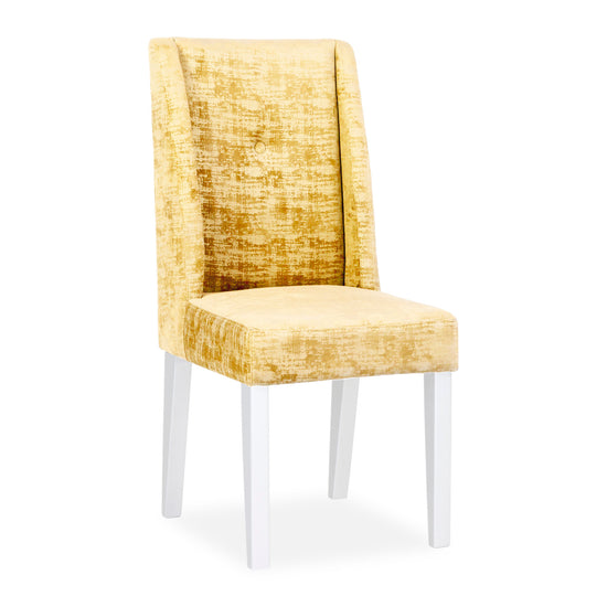 Silla elaborada en Madera de Roble y espumas certificadas, tapizado en tela tipo Velvet con diseño macerado a prueba de agua y suave al tacto, color Oro, patas 100% roble color Blanco. Medidas: 106x58x48 cm.