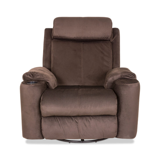 Sillón con sistema de reclinación mecánico (palanca) y espuma ultra confort certificada: Conoce un sillón con funcionalidad de mecedora y giratoria, incluye portavasos, tela de Microfibra y viene en color Chocolate. Medidas: 95X97X89 cm.