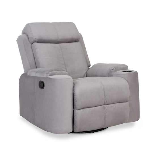 Date el regalo perfecto con el sillón con sistema de reclinación mecánico y funcionalidad de mecedora y giratoria hecho de madera. Viene con portavasos, tela tipo Microfibra suave color Gris, relleno de algodón siliconado que realza la comodidad, con espumas antideformación. Medidas: 95X97X89 cm.