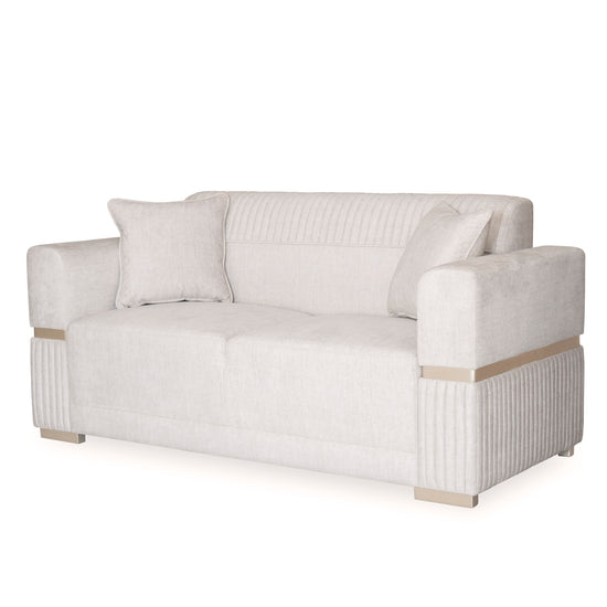 El Sofá 2 Puestos Dhara en Velvet Atlas mármol aporta suavidad y sofisticación a tu sala. Su textura aterciopelada crea una experiencia acogedora, mientras los detalles champaña y el brazo desmontable ofrecen versatilidad y elegancia en cada espacio.