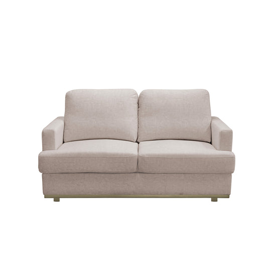 El Sofá Luka de 2 puestos destaca por su tapizado en velvet beige de tacto suave y base color champaña que realza su elegancia. Compacto y versátil, es ideal para salas modernas, ofreciendo confort y estilo en un diseño sofisticado.