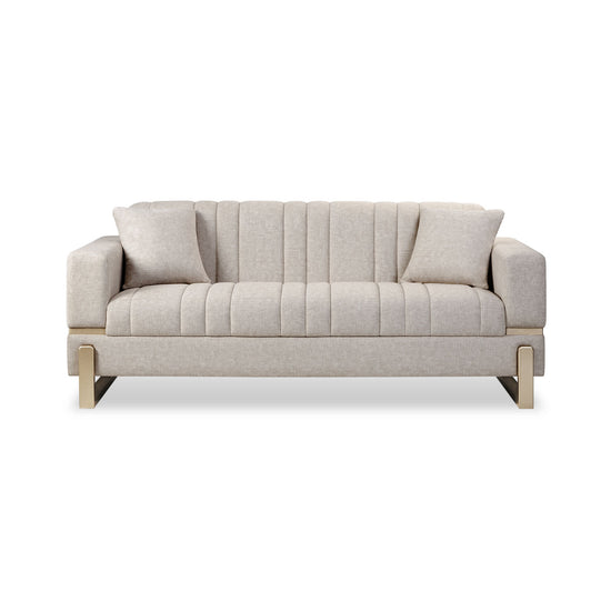 El Sofá Bonn destaca por su diseño elegante y envolvente, pensado para cautivar a primera vista. Su respaldo y asiento cuentan con un acolchado uniforme que aporta confort y armonía visual. Los brazos incorporan delicadas incrustaciones de madera, añadiendo un detalle distintivo y sofisticado al conjunto.