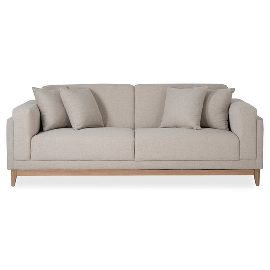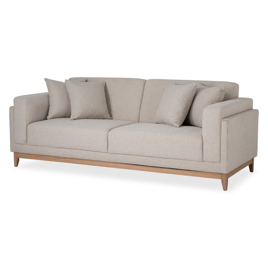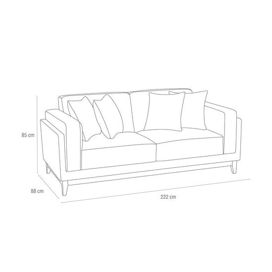 Amplio y elegante sofá 3 puestos, tapizado en tela suave al tacto para una experiencia de confort inigualable. Su sócalo de madera aporta un toque de elegancia y durabilidad. Incluye cojines decorativos que añaden estilo y comodidad, convirtiéndolo en la pieza perfecta para cualquier sala de estar moderna y acogedora.