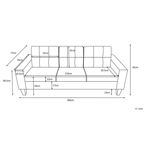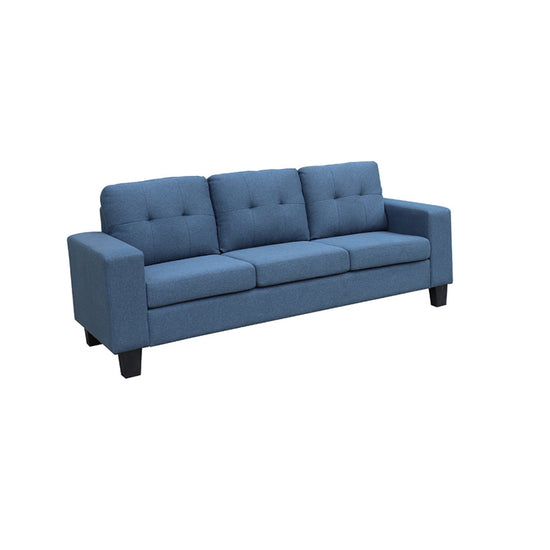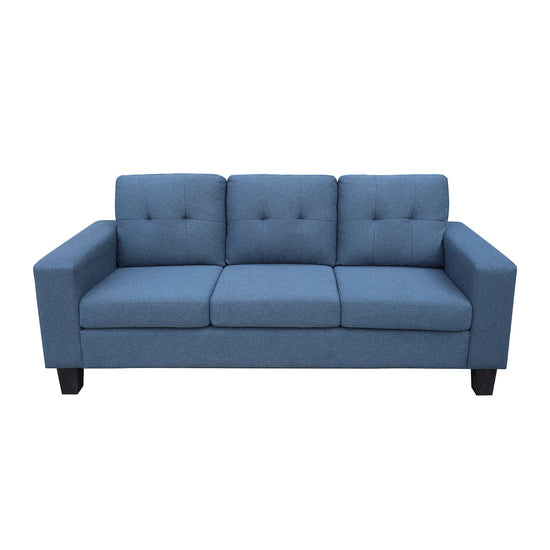 El sofá 3 puestos Diamante, Lino Azul, cuenta con un diseño con cojines capitoneados y líneas rectas combina elegancia y comodidad, ideal para realzar cualquier sala. La estructura sólida y los asientos acolchados ofrecen durabilidad y confort para el uso diario.