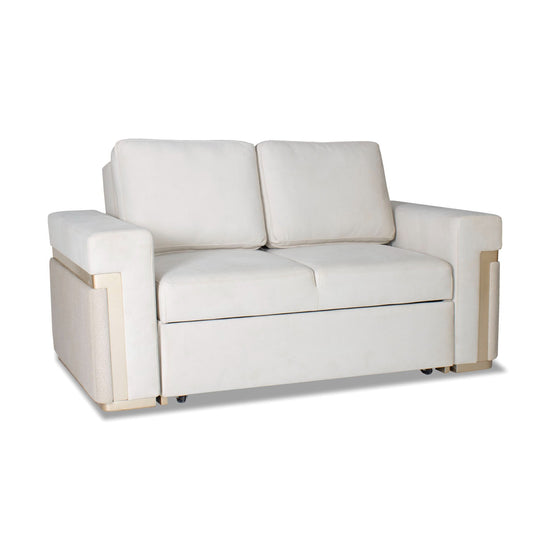 El Sofá Cama Dante de 167 Cm en Velvet Siena marfil ofrece suavidad y estilo con detalles champaña. Su práctico sistema tipo carrito con click clack lo convierte en cama en segundos. Incluye brazos desarmables que facilitan su transporte y adaptabilidad en cualquier espacio de tu hogar.