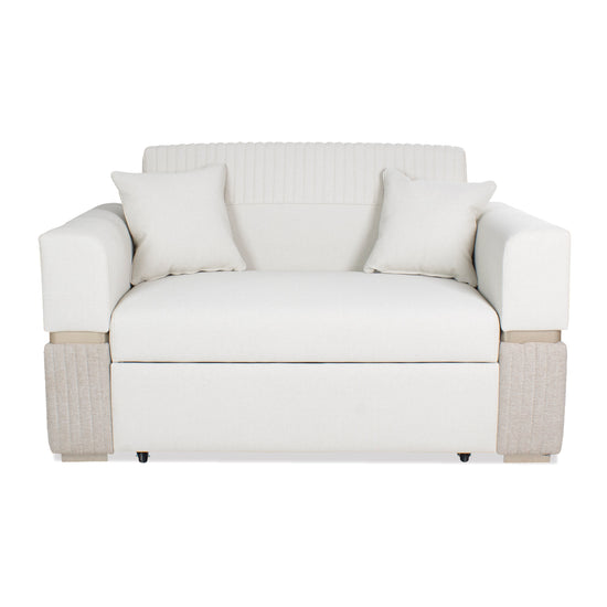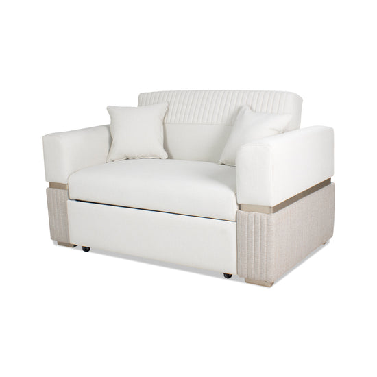 El Sofá Cama Dhara Eurolino Blanco Puro, Champaña 145 cm con Brazo desmontable es perfecto para quienes buscan un mueble funcional y elegante para espacios reducidos. Su diseño tipo carrito incluye la funcionalidad click clack en la espalda, permitiendo convertirlo fácilmente en cama. Tapizado en Eurolino, una tela de alta calidad conocida por su resistencia, fácil limpieza y características antilíquidos, este sofá cama es ideal para quienes necesitan comodidad y durabilidad sin ocupar mucho espacio.