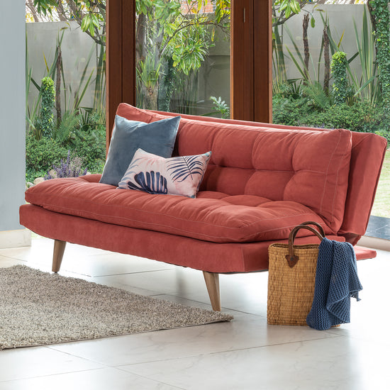 ¿Necesitas un sofá cama con sistema de apertura Click Clak? La estructura de madera de roble color Natural y espumas certificadas le da un aspecto agradable y fuerte. El relleno de algodón siliconado le da máximo confort, y la tela tipo Microfibra es delicado al tacto.