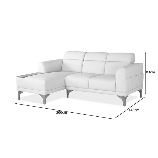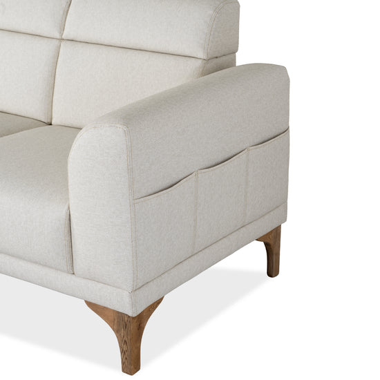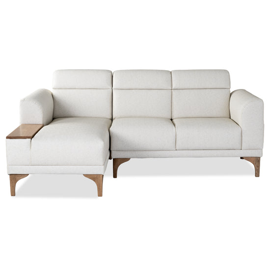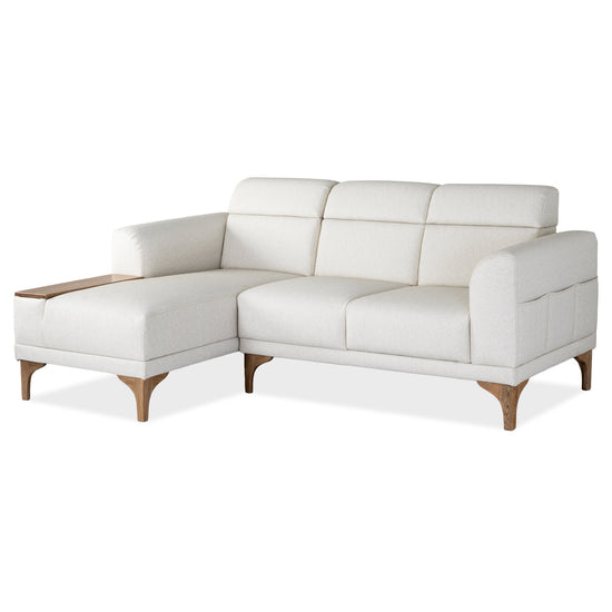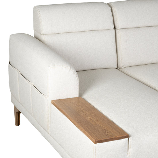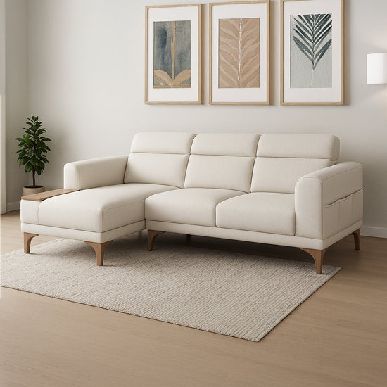 El sofá en L Carla combina estilo contemporáneo y funcionalidad inteligente. Tapizado en tela eurolino de fácil limpieza, es ideal para el uso diario sin sacrificar elegancia. Su diseño incluye chaise longue izquierdo, y un práctico apoya brazo en madera natural, perfecto para apoyar bebidas o libros.Además, cuenta con bolsillos laterales que brindan espacio extra de almacenamiento para controlar el desorden sin perder estética