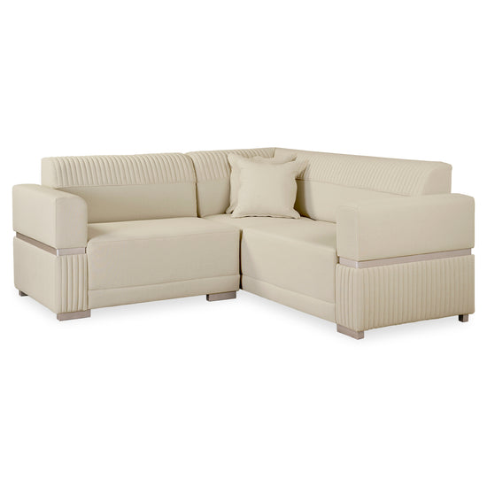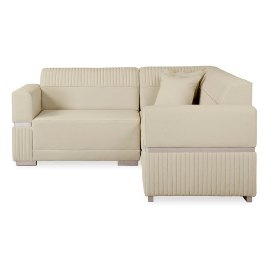 Renueva tu sala con el Sofá en L Dhara Chenille Almendra de 3 piezas. Su tapizado en tela tipo chenille ofrece suavidad y elegancia, mientras el tono champaña aporta calidez y estilo. Con brazo desmontable para fácil transporte, este sofá combina confort, amplitud y diseño contemporáneo para tu hogar.