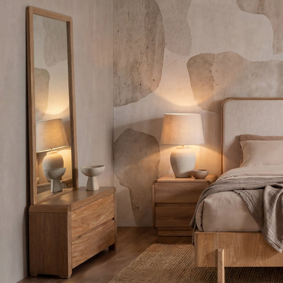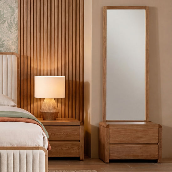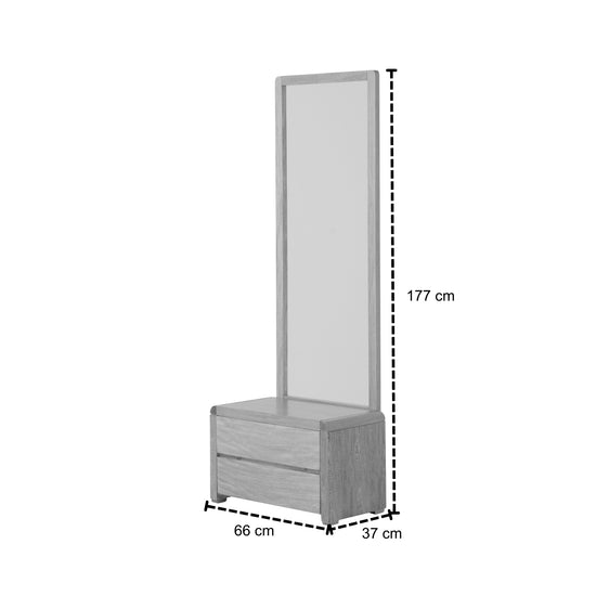 Realza la elegancia de tu espacio con nuestro tocador Calvin, elaborado con una estructura de madera de roble en color natural que destaca la hermosa veta de la madera. Este diseño funcional incluye dos amplias gavetas para organizar tus accesorios y un marco con espejo de cuerpo completo que te permite apreciarte cuerpo completo.