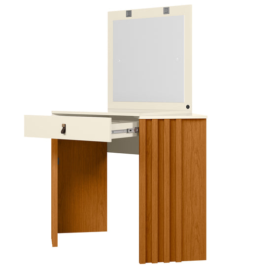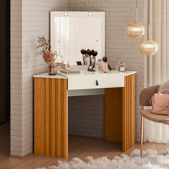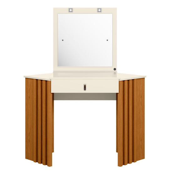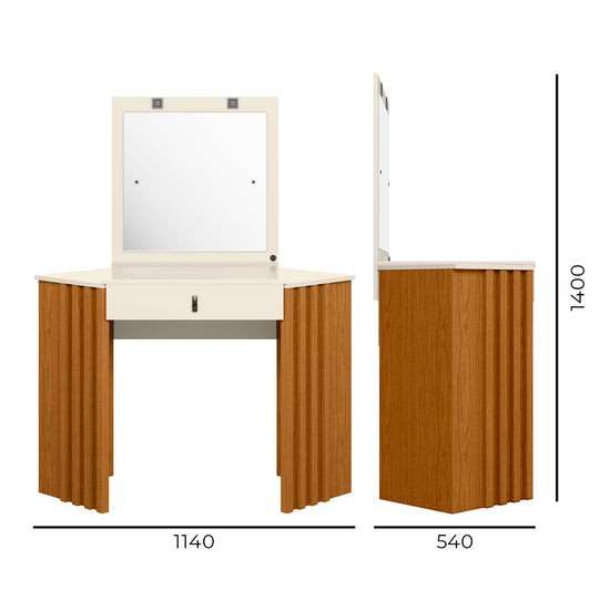 El Tocador Ely Esquinero es la combinación perfecta entre diseño moderno y practicidad. Su estructura en MDP con acabado en pintura UV proporciona resistencia y un brillo sutil que realza su sofisticación. Diseñado para adaptarse a espacios reducidos, su formato esquinero aprovecha cada rincón sin sacrificar estilo ni comodidad. Equipado con un espejo amplio con 2 luces LED, ofrece una iluminación perfecta para tu rutina de belleza. Además, su gaveta con amplio espacio de almacenamiento y sus listones laterales decorativos le dan un toque elegante y funcional.