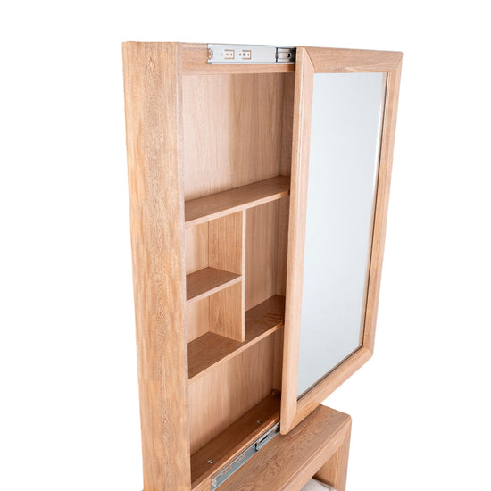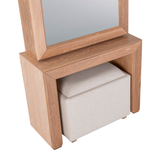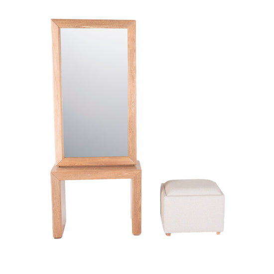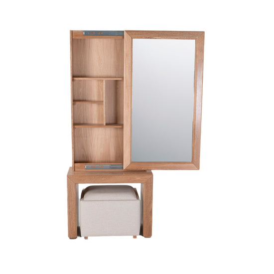 El Tocador Marriot es la combinación perfecta de elegancia, organización y comodidad. Su estructura, elaborada en madera roble, aporta calidez y durabilidad, realzando la decoración de cualquier espacio. Cuenta con prácticas repisas internas para organizar maquillaje, perfumes y accesorios, manteniendo todo en orden y al alcance de la mano. Su espejo deslizable añade un toque moderno y funcional. Además, incluye un puff, ideal para mayor comodidad y que se integra perfectamente en su diseño, permitiendo un almacenamiento discreto.