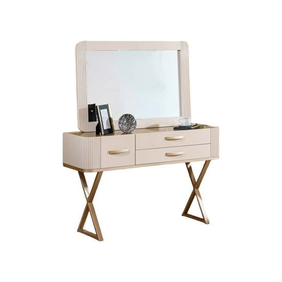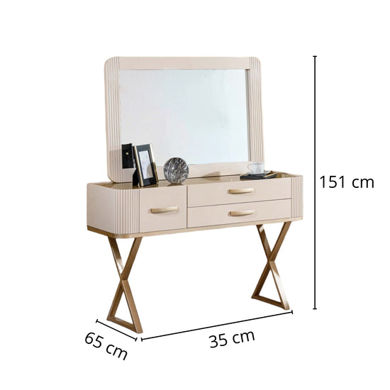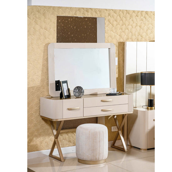 Añade un toque de elegancia y sofisticación a tu dormitorio con nuestro lujoso tocador, diseñado para satisfacer las necesidades de estilo y funcionalidad de los más exigentes. Este mueble no solo es ideal para tu rutina de belleza, sino que también eleva la estética de cualquier habitación. Estructura de madera de alta calidad con líneas limpias y acabados impecables. Espejo enmarcado con elegancia, amplía visualmente el espacio y añade glamour. Amplio almacenamiento para guardar productos de belleza, joyas y accesorios.